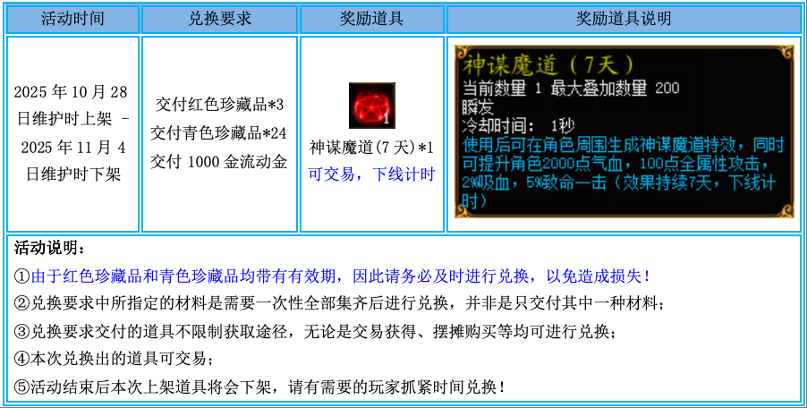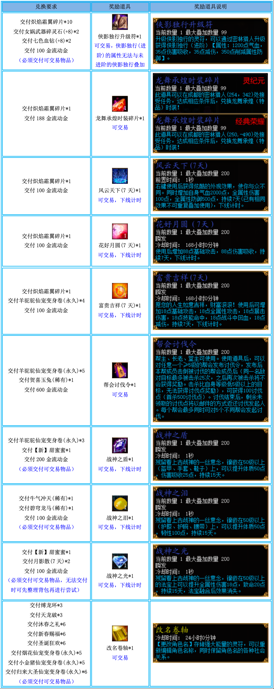 3、活动结束后,兑换列表中的道具将会下架,请有需要的玩家把握好时机。