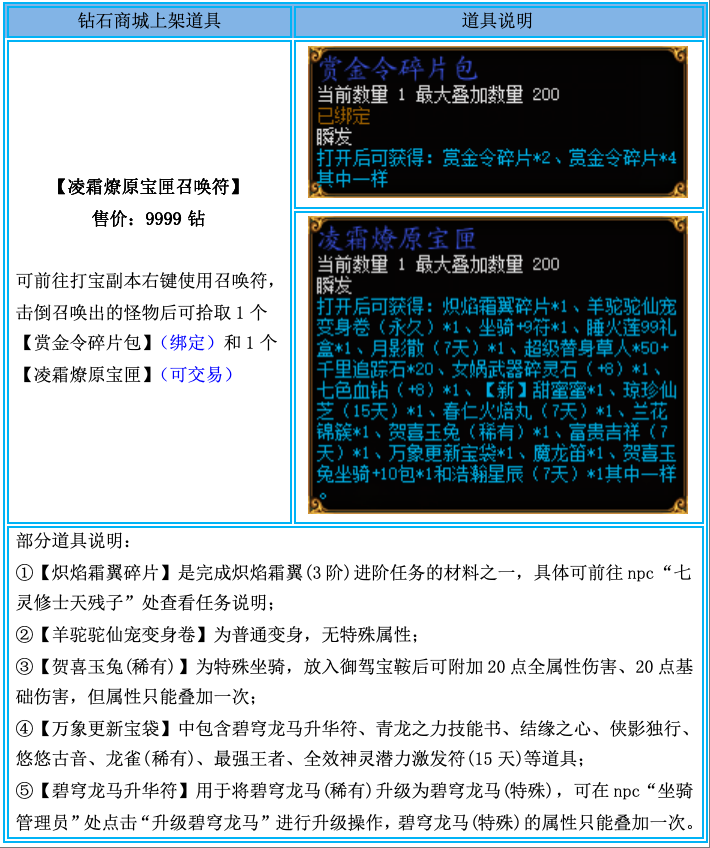 1、【凌霜燎原宝匣召唤符】仅限钻石商城购买,通过摆摊购买、互相交易、邮件领取、拍卖购买等非钻石商城购买方式获得的,不计算在活动区服内;