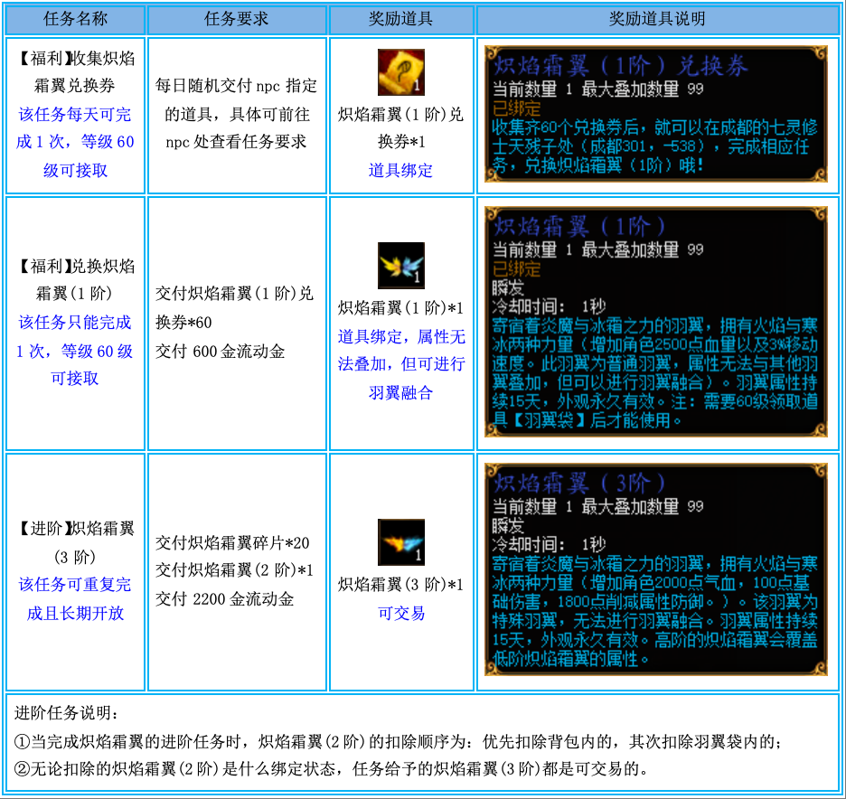 ①炽焰霜翼(3阶)可使用1个炽焰霜翼(2阶)+20个炽焰霜翼碎片+2200流动金进行兑换;
