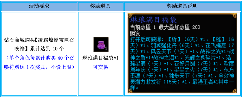 2、活动期间,单个角色在钻石商城每累计购买40个【凌霜燎原宝匣召唤符】,可获得1个可交易的“琳琅满目福袋”,不设上限。