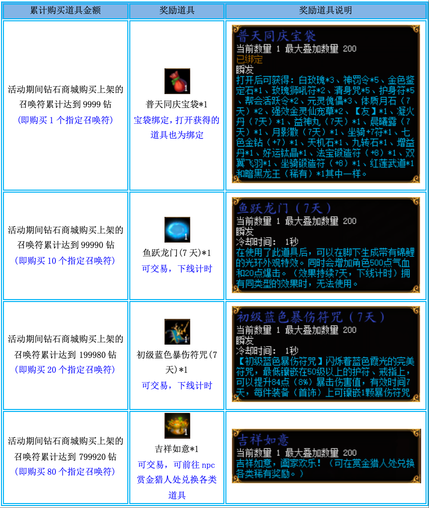3、活动计算的是购买指定召唤符累计达到的钻石金额;