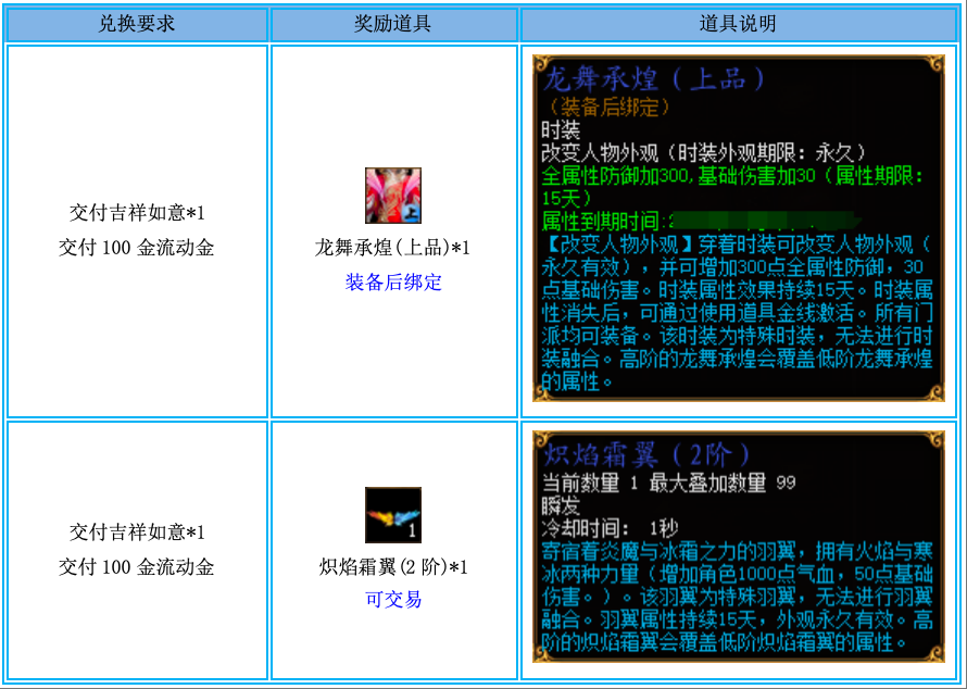 活动期间,可使用【吉祥如意】在npc“赏金猎人”处兑换以下道具: