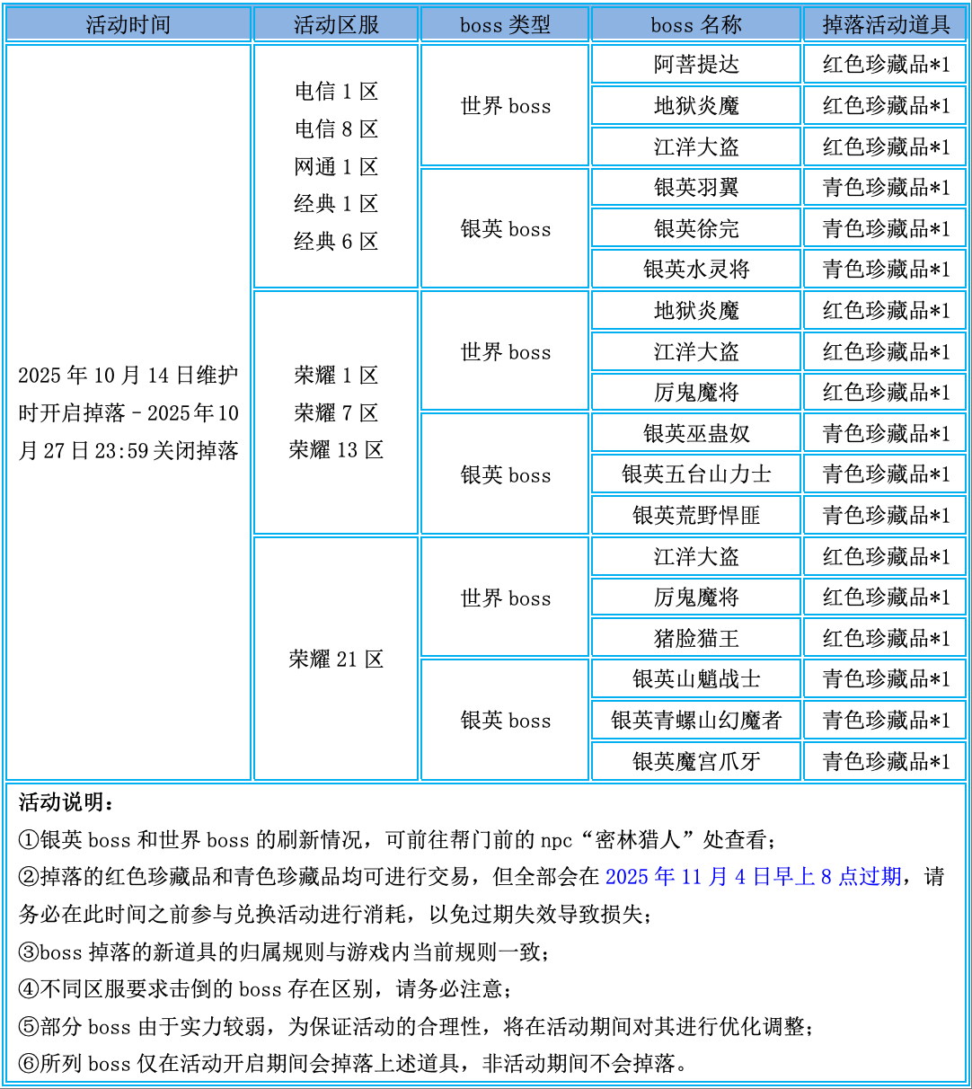 1、活动期间,击倒以下指定boss时将会掉落活动道具: