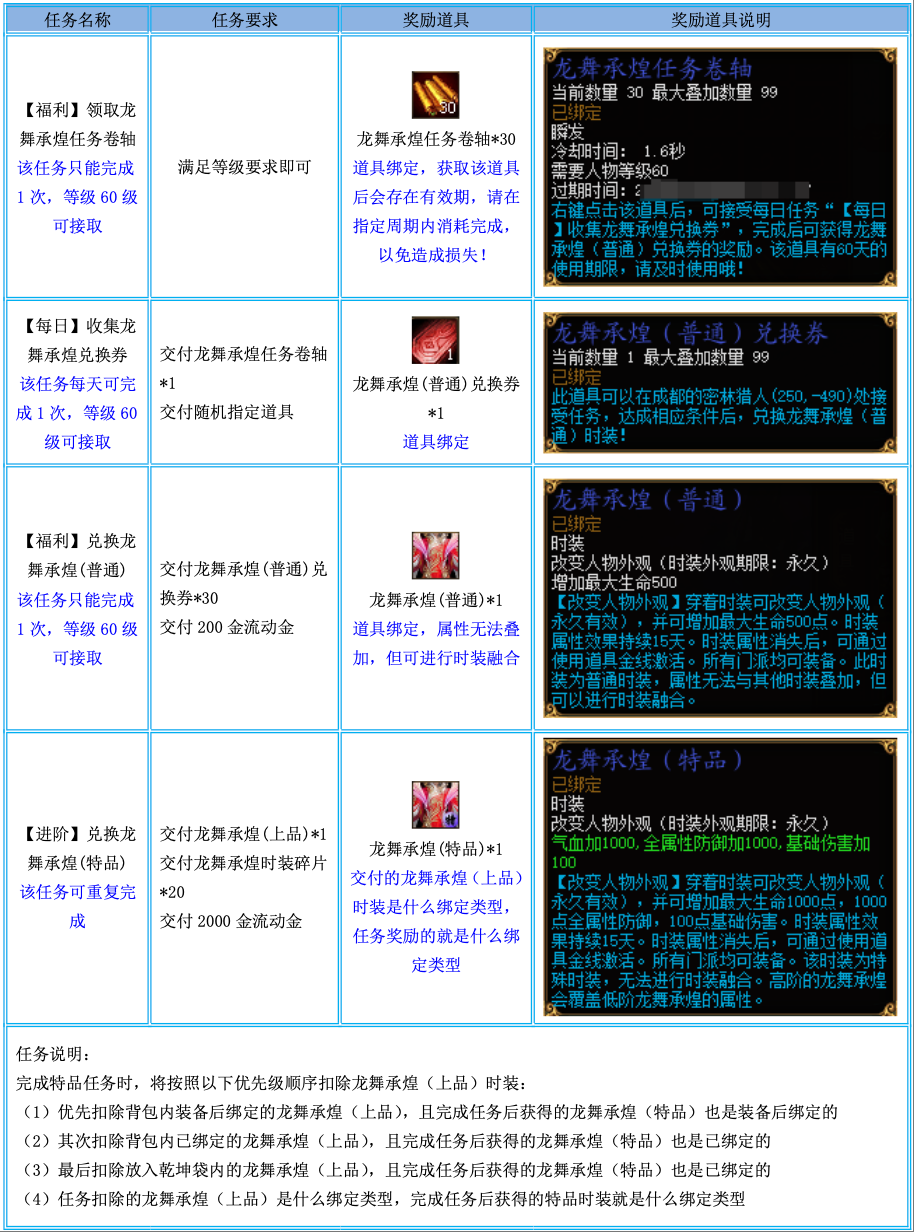 1、优先扣除背包内装备后绑定的龙舞承煌(上品),且完成任务后获得的龙舞承煌(特品)也是装备后绑定的